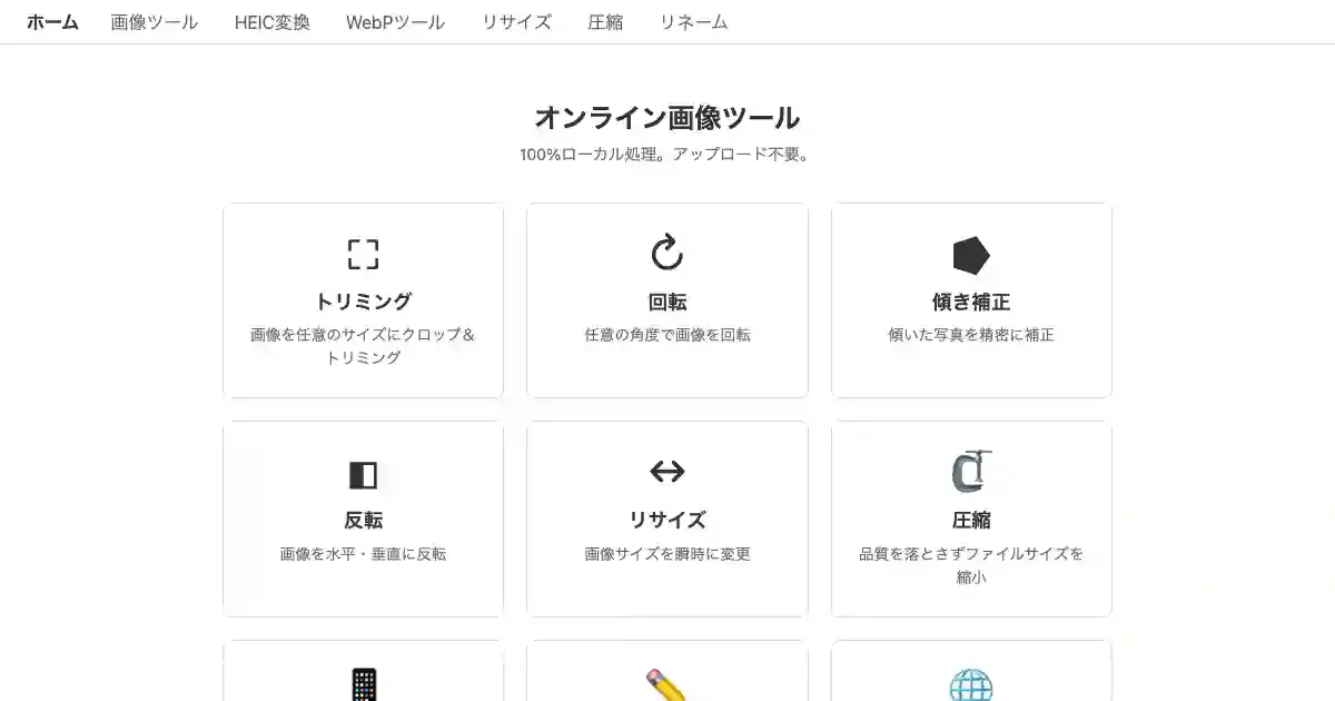 ブラウザで動作する画像編集・変換ツール。トリミング、リサイズ、圧縮、回転、HEIC→JPG変換、WebP変換など多彩な機能をアップロード不要でローカル処理できる。