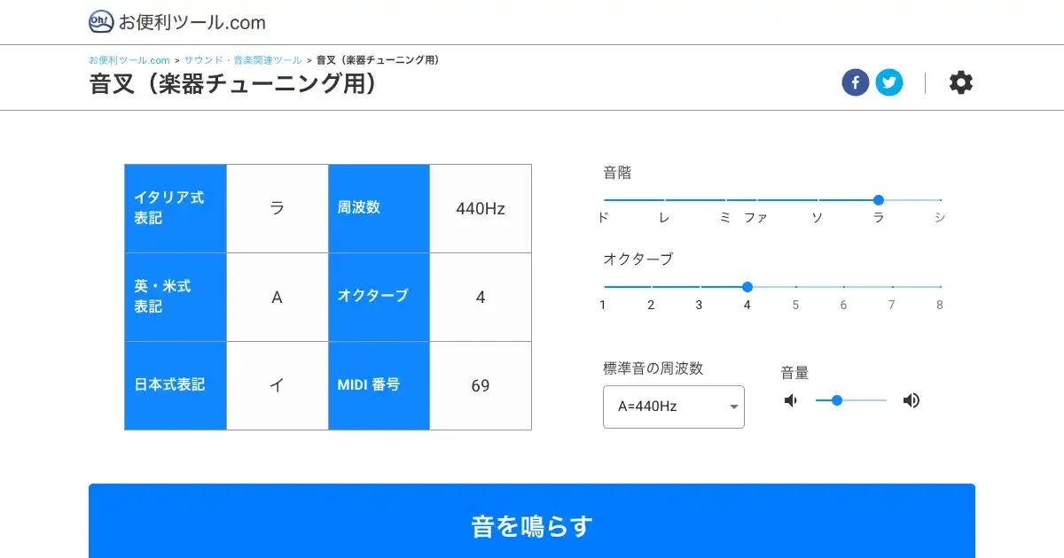 ブラウザで使えるデジタル音叉ツール。音階・オクターブをスライダーで選択でき、ギター・ベース・ヴァイオリン等の楽器チューニング用プリセットボタンを搭載。基準周波数も変更可能。