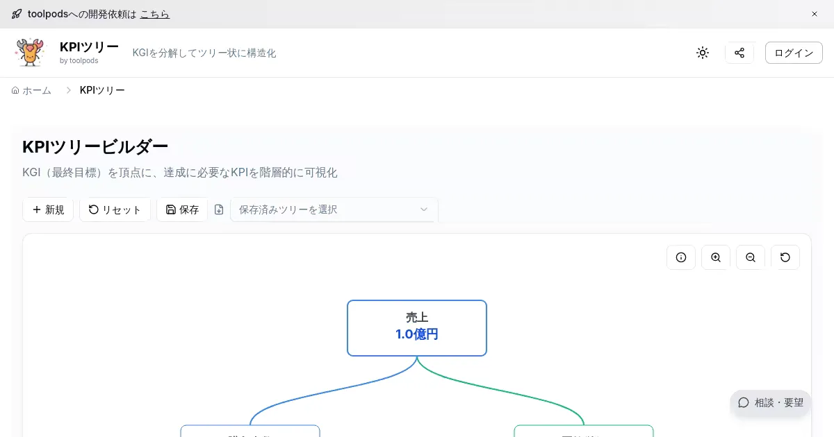 KPI ツリーをビジュアルで構築するツール。目標指標の分解と関係性を階層ツリー形式で整理できる。