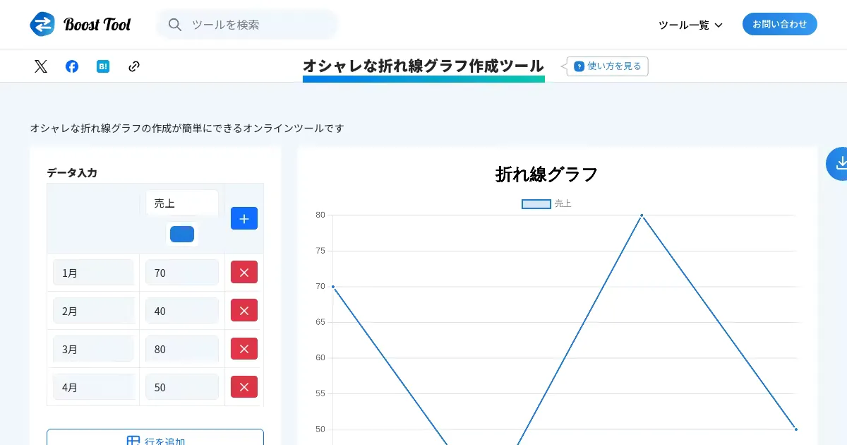 データを入力してスタイリッシュな折れ線グラフを作成し、画像としてダウンロードできる無料オンラインツール。時系列データの可視化に活用できる。