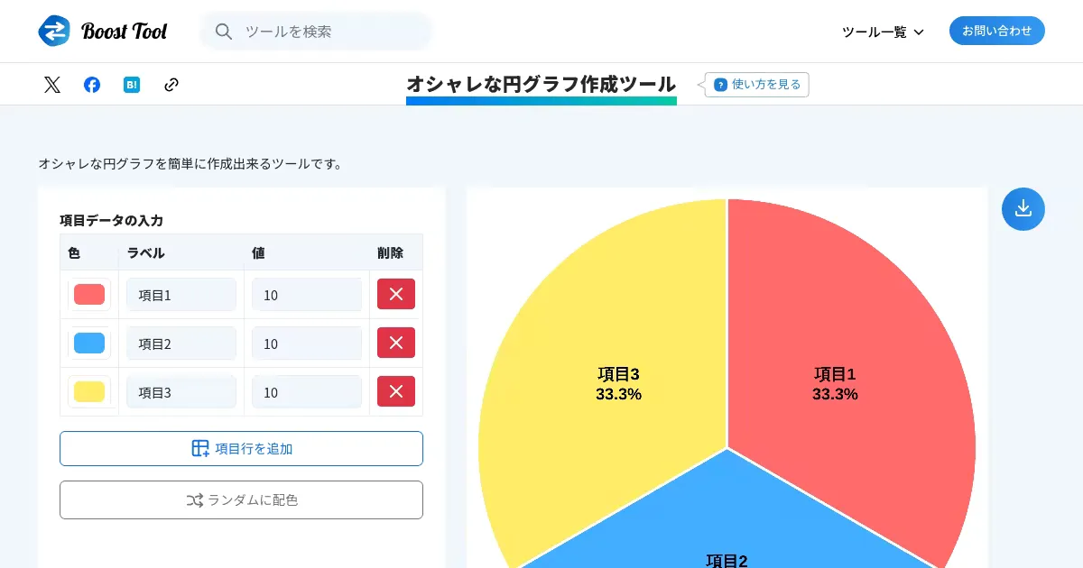 データを入力してスタイリッシュな円グラフを作成し、画像としてダウンロードできる無料オンラインツール。プレゼン資料やドキュメントへの埋め込みに活用できる。