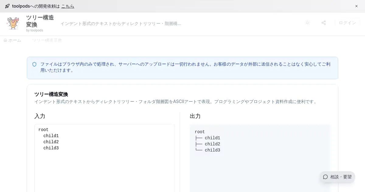テキスト形式のツリー構造をビジュアルなダイアグラムで表示するツール。フォルダ構造やデータ階層の可視化に活用できる。