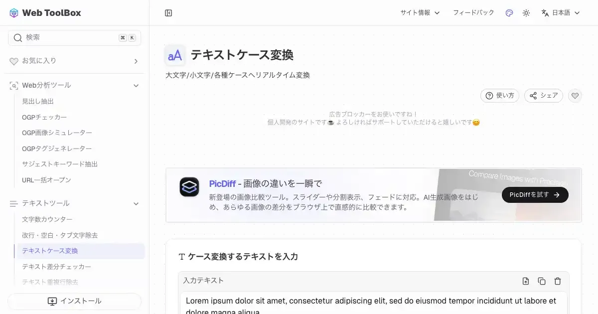 テキストをキャメルケース・スネークケース・パスカルケース・ケバブケースなど各種ケースに変換する無料ツール。プログラミング時の命名規則変換やデータ加工に活用できる。