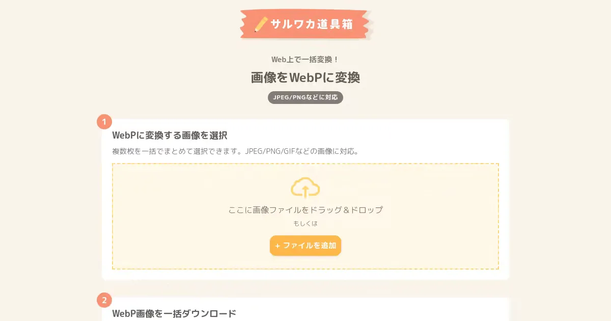 PNG・JPEG・GIF画像をWebPに一括変換するブラウザ完結ツール。サーバーへのアップロード不要でローカル処理し、変換後の画像はZIPで一括ダウンロード可能。