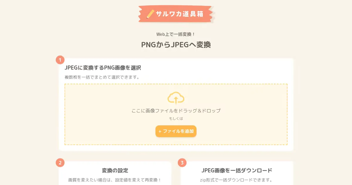PNG画像をJPEGに一括変換するブラウザ完結ツール。画質の4段階調整、複数画像のZIP一括ダウンロードに対応。サーバーへの送信なしでローカル処理するためプライバシーも安心。