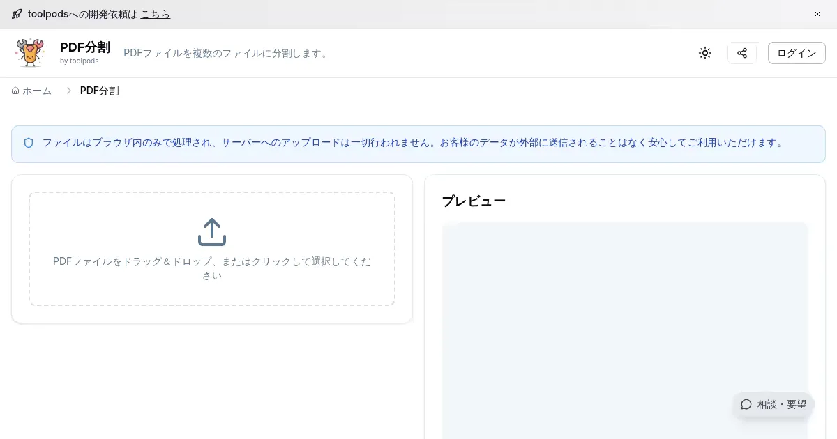 PDF ファイルを任意のページで分割するツール。ページ範囲を指定して複数の PDF に分解できる。