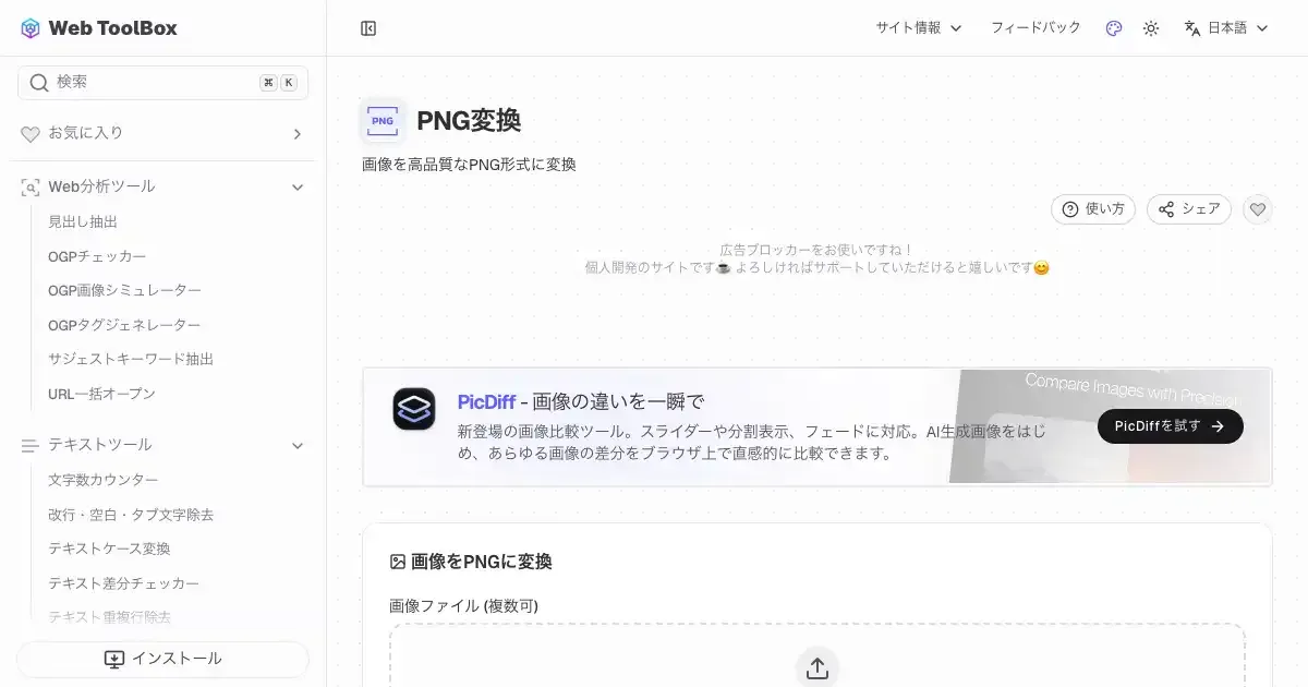 画像ファイルをブラウザ上で PNG 形式に変換する無料ツール。JPG・WebP など各種形式から PNG への変換に対応し、処理はブラウザ内で完結するためプライバシーが保護される。