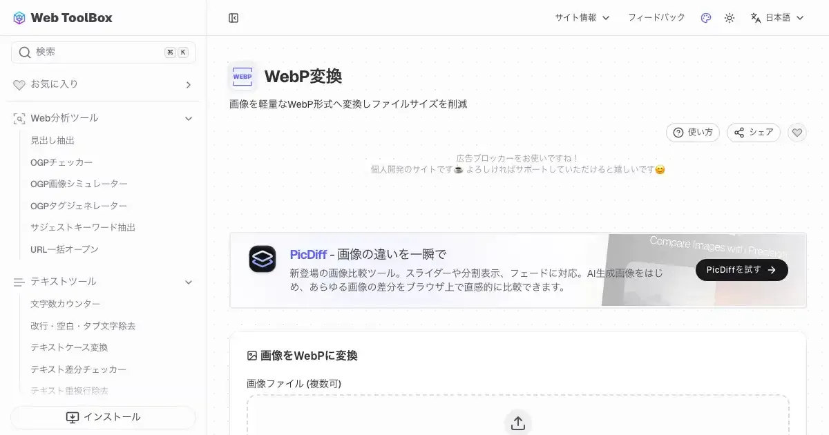 画像ファイルをブラウザ上で WebP 形式に変換する無料ツール。PNG・JPG など各種形式から WebP への変換に対応し、品質を調整しながら軽量な画像ファイルを生成できる。