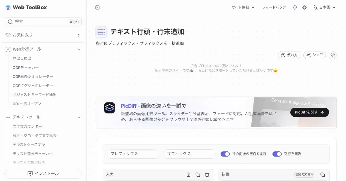 テキスト行頭・行末追加 (web-toolbox.dev)