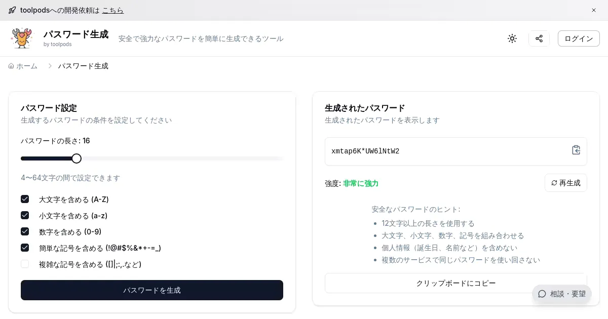 任意の文字種・長さでランダムなパスワードを生成する無料ツール。大文字・小文字・数字・記号の組み合わせを設定でき、複数のパスワードを一度に生成することも可能。