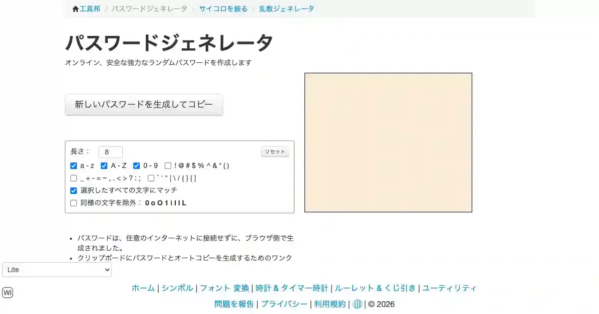 オンラインのランダムパスワード生成ツール。文字数や文字種(大文字・小文字・数字・記号)をカスタマイズして、強力で安全なパスワードを即座に作成できる。