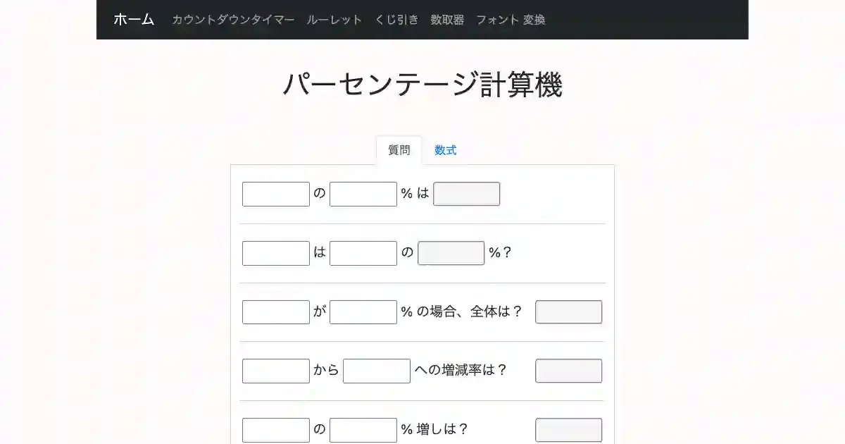 パーセント計算を素早く行えるオンライン計算機。ある数値が全体の何%かの計算、割引率・増減率の計算などに対応している。