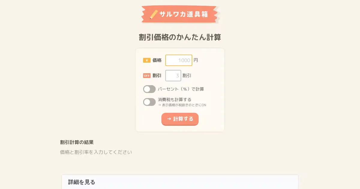 元の価格と割引率(%オフ・割引)を入力して割引後の価格を即座に計算するツール。複数の計算結果を保存して合計金額も確認できる。