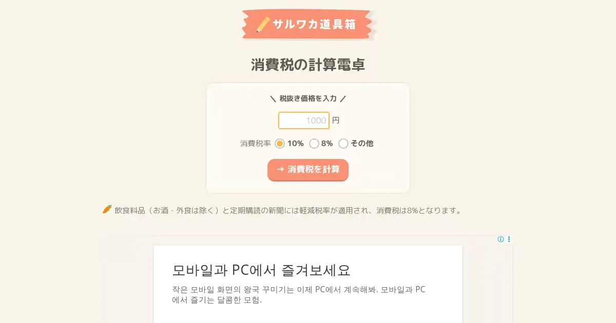 税抜き価格と税率(10%・8%軽減税率)を選択して税込み価格と消費税額を即座に計算する電卓ツール。計算式も表示される。