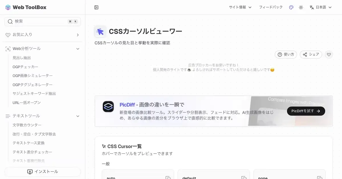 CSSカーソルビューワー (web-toolbox.dev)