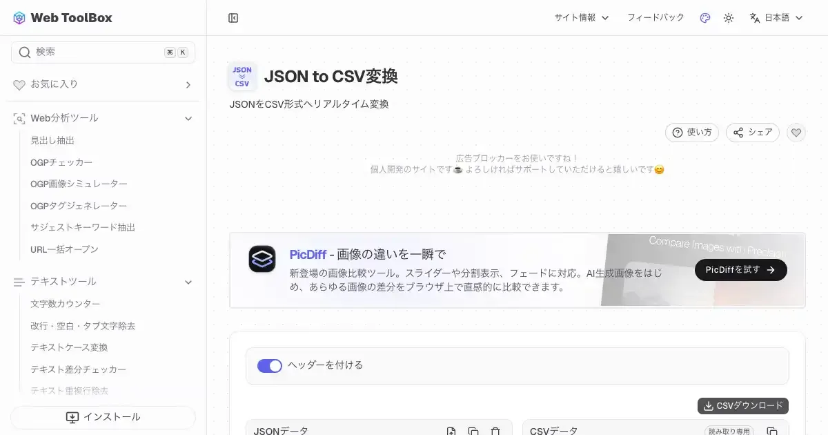 JSON to CSV変換 (web-toolbox.dev)