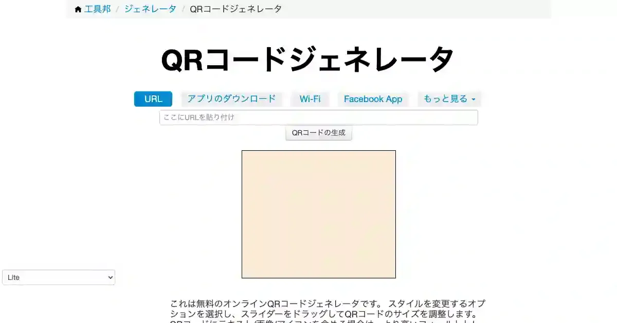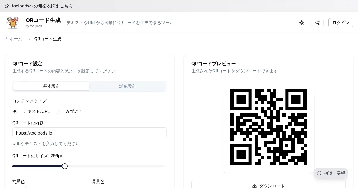 任意のテキストや URL から QR コードを生成する無料ツール。サイズや誤り訂正レベルを設定でき、生成した QR コード画像をダウンロードして利用できる。
