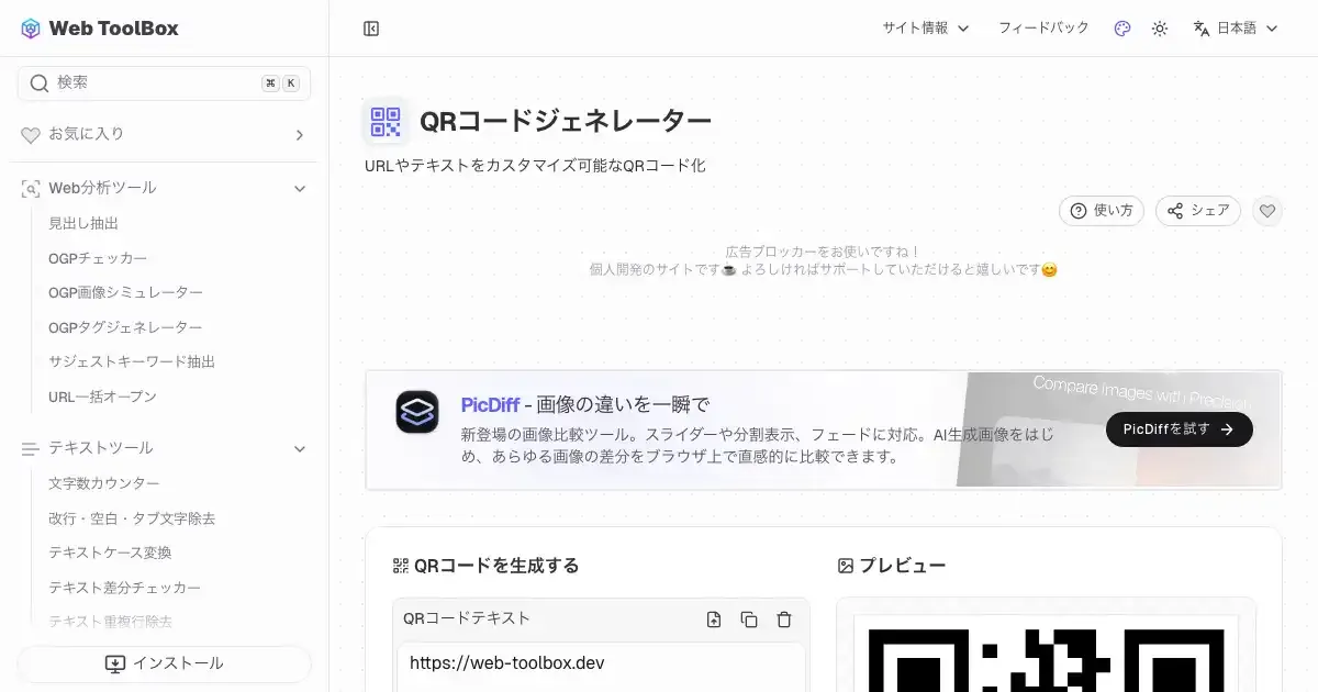任意のテキストや URL から QR コードを生成するツール。絵文字にも対応し、背景色・前景色・サイズ・マージン・誤り訂正レベルのカスタマイズが可能。
