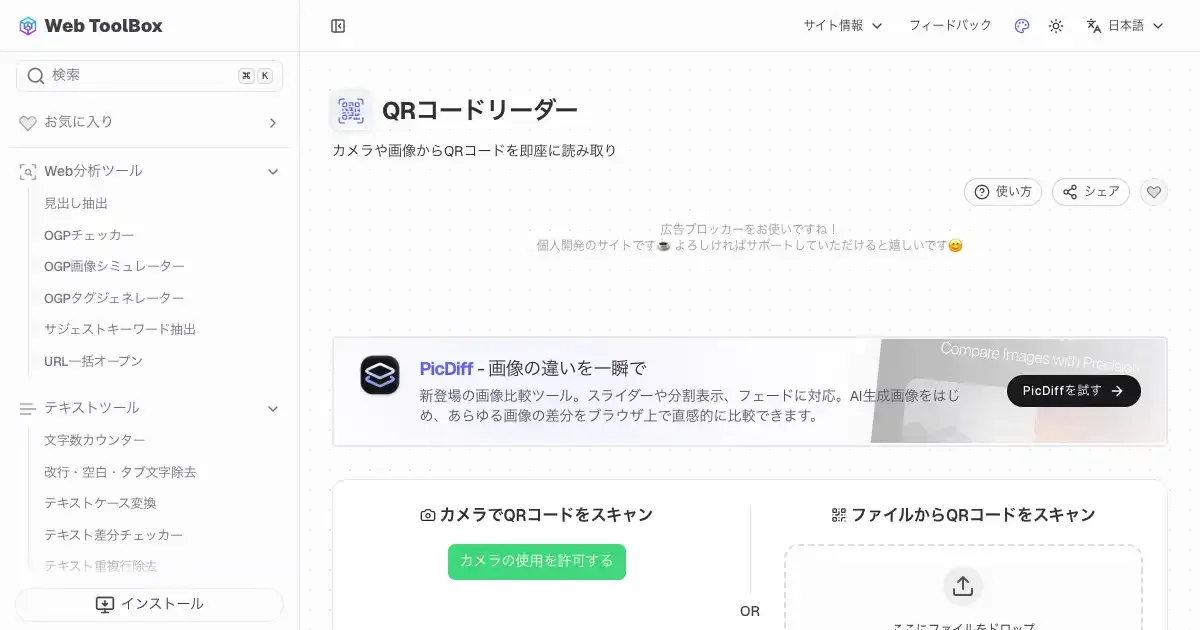 画像ファイルのアップロードまたはカメラを使って QR コードを読み取る無料ツール。読み取り結果はブラウザ上に即座に表示され、インストール不要で利用できる。