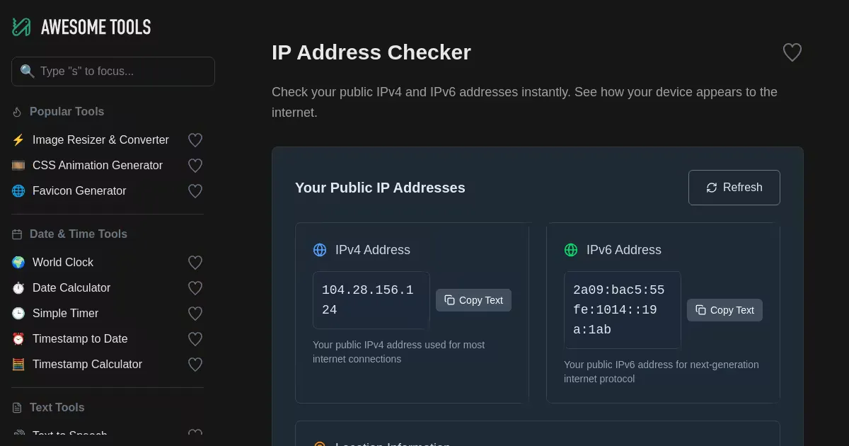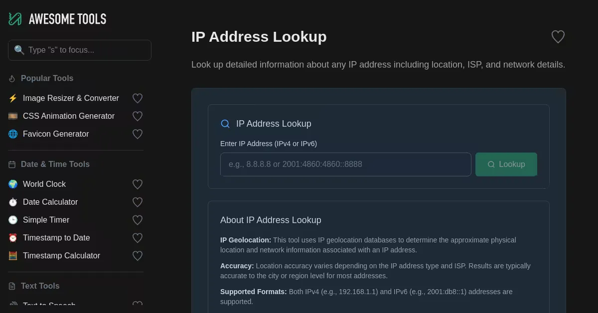 任意のIPアドレスの詳細情報(位置情報・ISP・ネットワーク情報など)を検索できるツール。開発者やシステム管理者向けのネットワークユーティリティ。