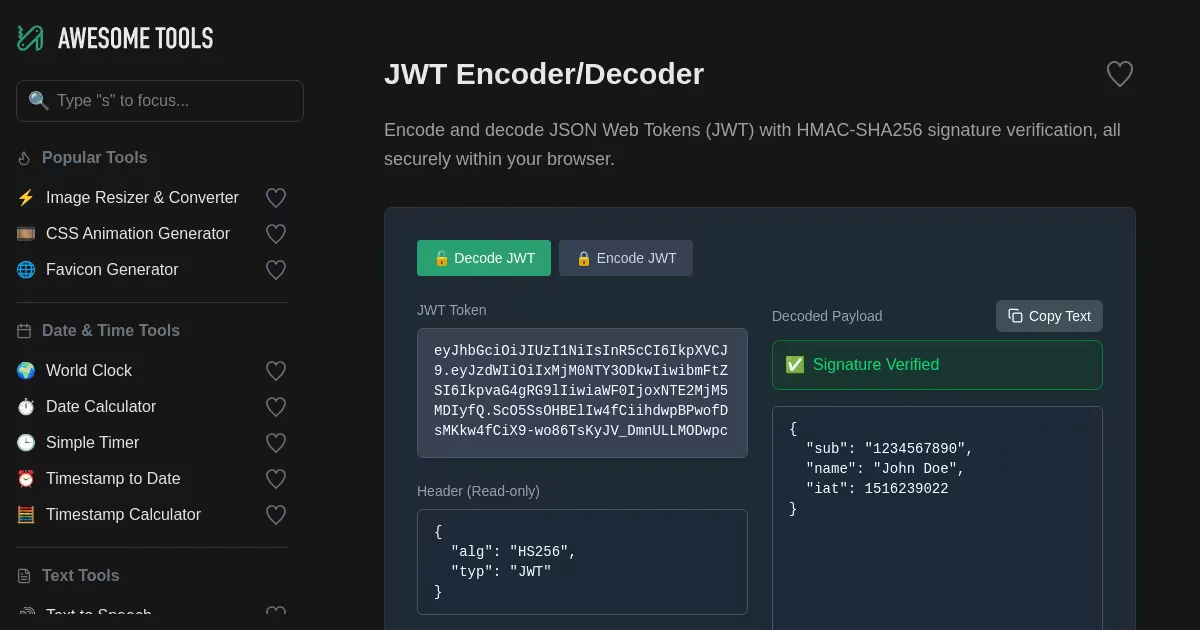 HMAC-SHA256署名検証付きでJWT(JSON Web Token)をブラウザ内で安全にエンコード・デコードできるツール。ブラウザのWeb Crypto APIを使用し、シークレットやトークンがデバイス外に送信されることはない。