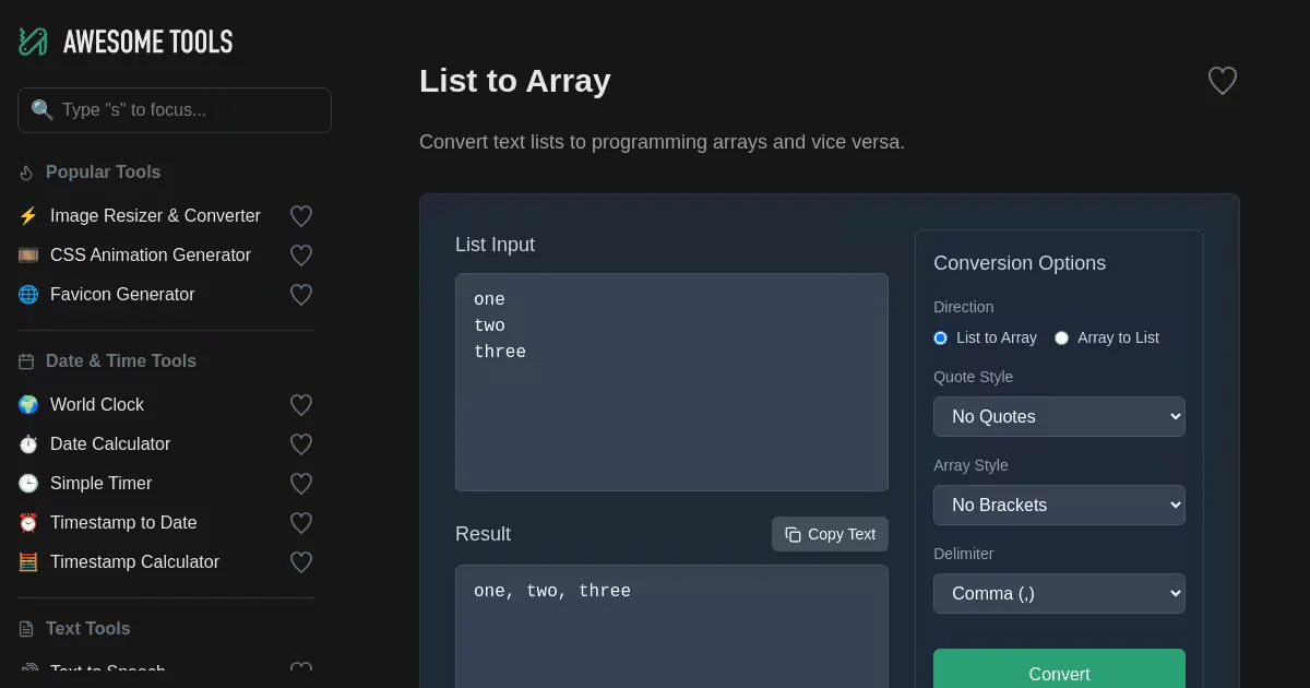 テキストリストとプログラミング配列を相互変換できるツール。クォートスタイル・ブラケット種類・デリミタ(カンマ・セミコロン・パイプ・タブ・カスタム)を自由にカスタマイズ可能。