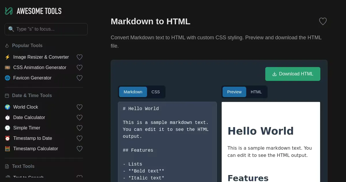 MarkdownテキストをカスタムCSSスタイル付きのHTMLに変換できるツール。リスト・太字・斜体・リンク・引用・コードブロックに対応。ライブプレビューとHTMLファイルのダウンロードが可能。