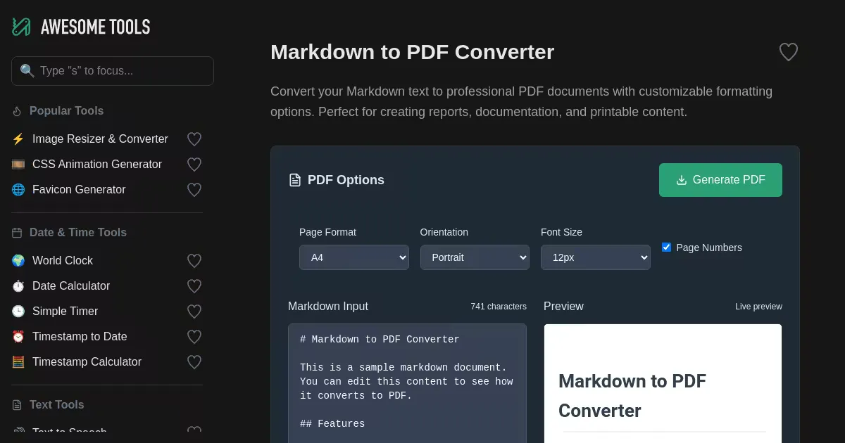 Markdown形式のテキストをPDFドキュメントにブラウザ上で変換できるツール。ドキュメント・レポート・共有用資料の作成に便利。ソフトウェアのインストール不要。