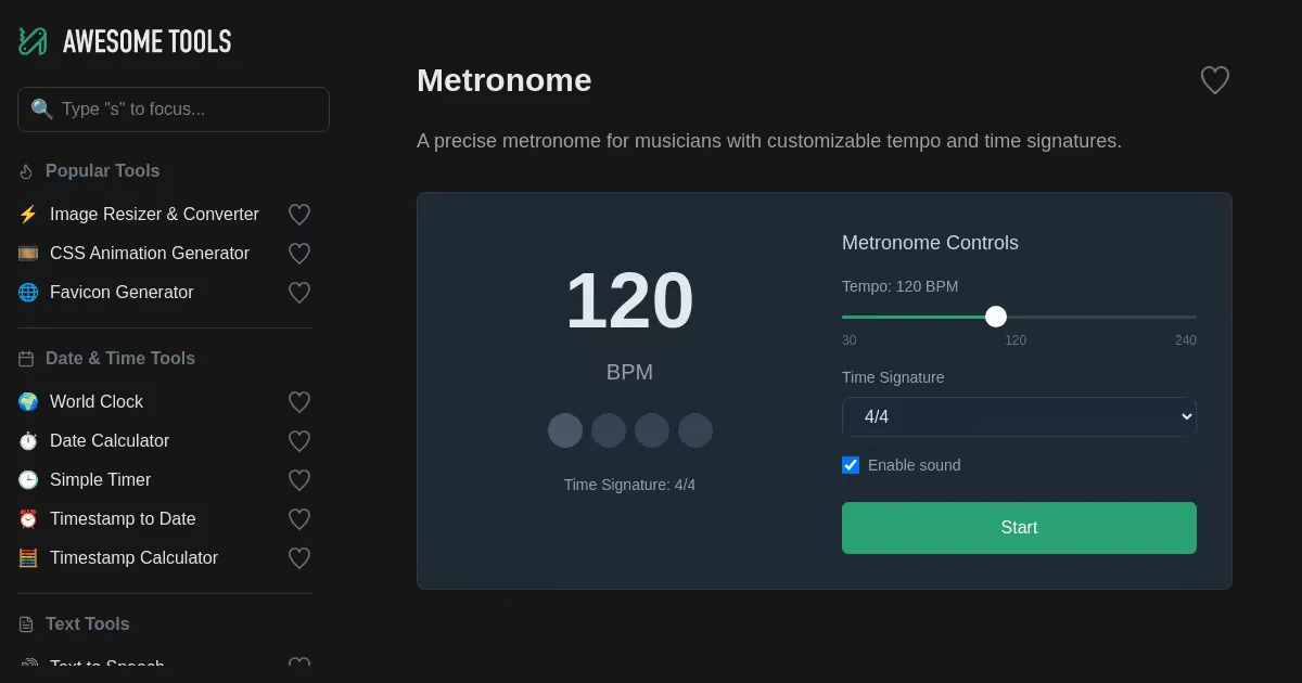 テンポ(BPM)と拍子を調整できるオンラインメトロノーム。4/4・3/4・6/8・9/8・12/8・5/4・7/4に対応し、楽器の練習やリズムキープに使える。