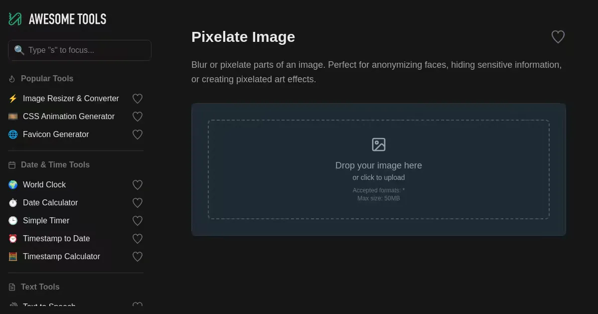 画像の特定部分をぼかしたりモザイク処理できるブラウザツール。顔の匿名化・個人情報の隠匿・ピクセルアートの制作などに活用できる。最大50MBのファイルに対応。