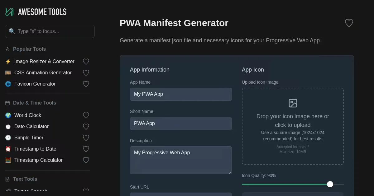 Progressive Web App用のmanifest.jsonファイルと必要なアイコンを生成できるツール。アプリ名・表示モード・向き・テーマカラーを設定し、16×16〜512×512pxまでのアイコンを自動生成してワンクリックで書き出せる。
