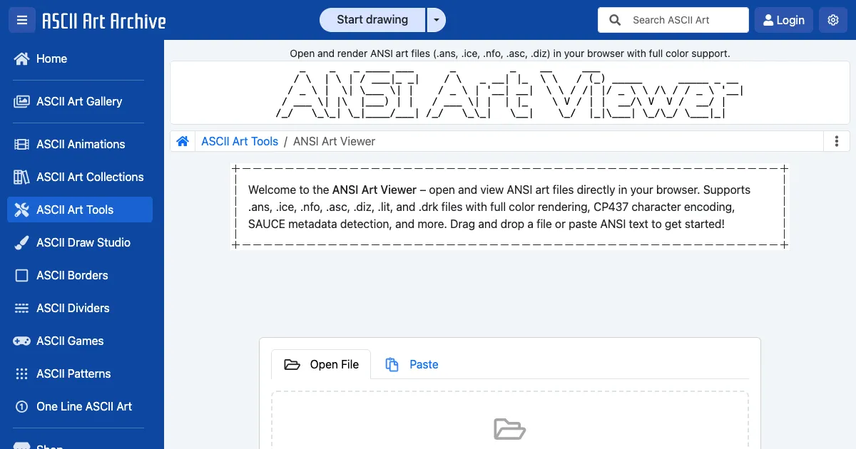 ANSIアートファイルをブラウザで表示するビューワー。.ans・.ice・.nfo・.asc・.diz形式のフルカラーレンダリング、CP437エンコーディング、SAUCEメタデータ検出、PNG・PDF・JSONへのエクスポートに対応。