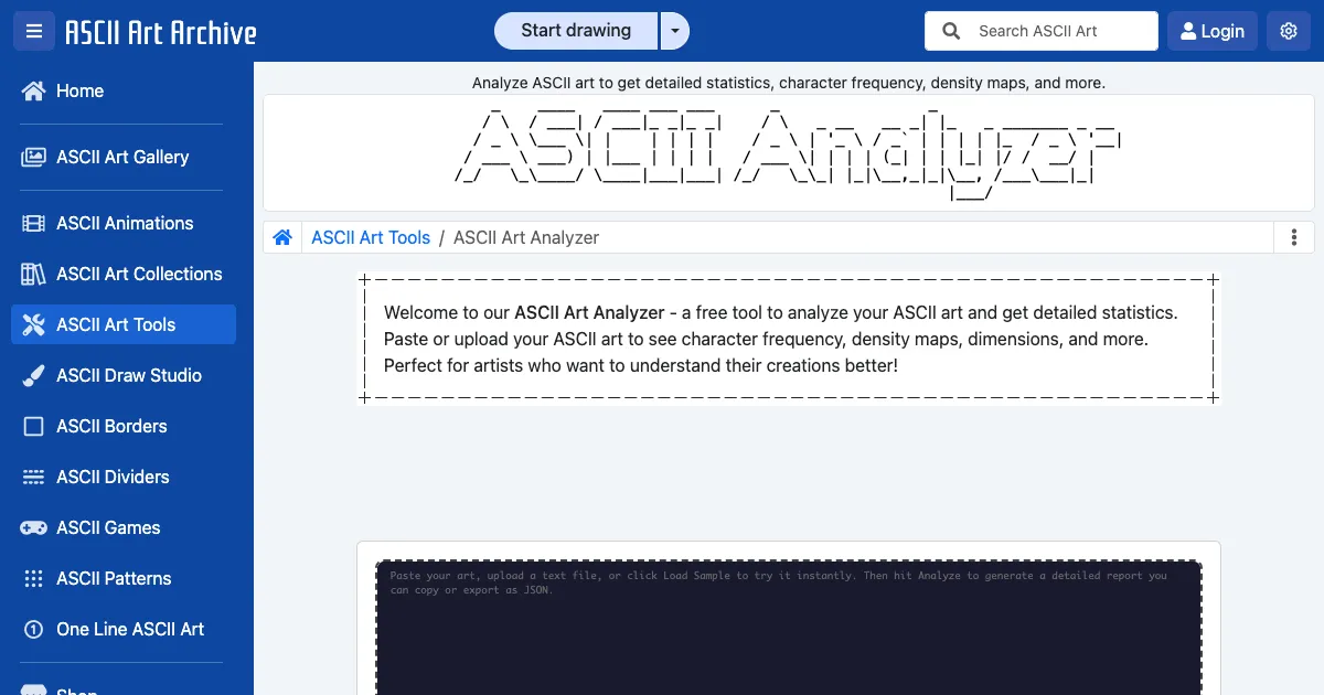 ASCIIアートを分析するブラウザ完結ツール。文字の出現頻度・密度マップ・スタイル検出・構造解析を提供し、テキストレポートやJSONでの出力に対応。