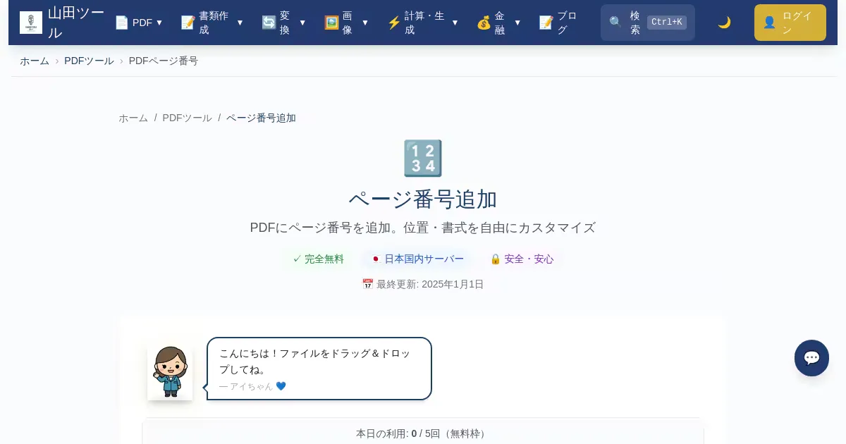 PDFにページ番号を追加。報告書や資料のページ管理に便利。位置・フォント・開始番号などカスタマイズ可能。
