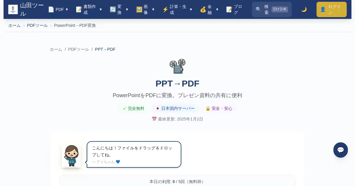 PowerPointファイル(.ppt/.pptx)をPDFに変換。プレゼン資料を配布用・印刷用PDFとして保存できる。