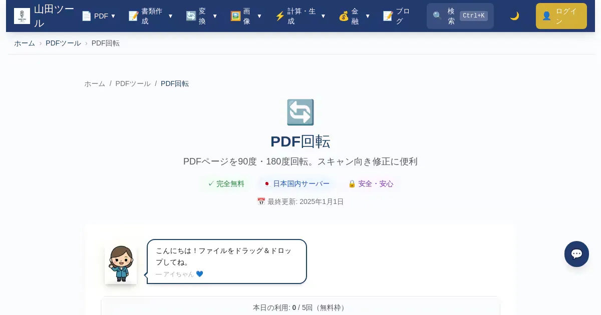 PDFのページを90・180・270度回転。スキャンで向きが狂ったPDFを修正でき、ページごとの個別回転と全ページ一括回転に対応。