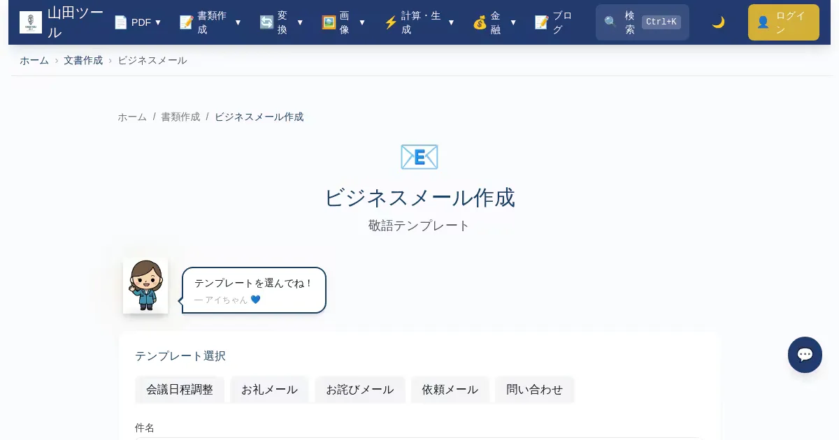 ビジネスメールのテンプレートを選んで簡単作成。お詫び、お礼、依頼など、シーン別の定型文を用意。正しい敬語のビジネスメールを無料で生成。登録不要でブラウザ上で完結。