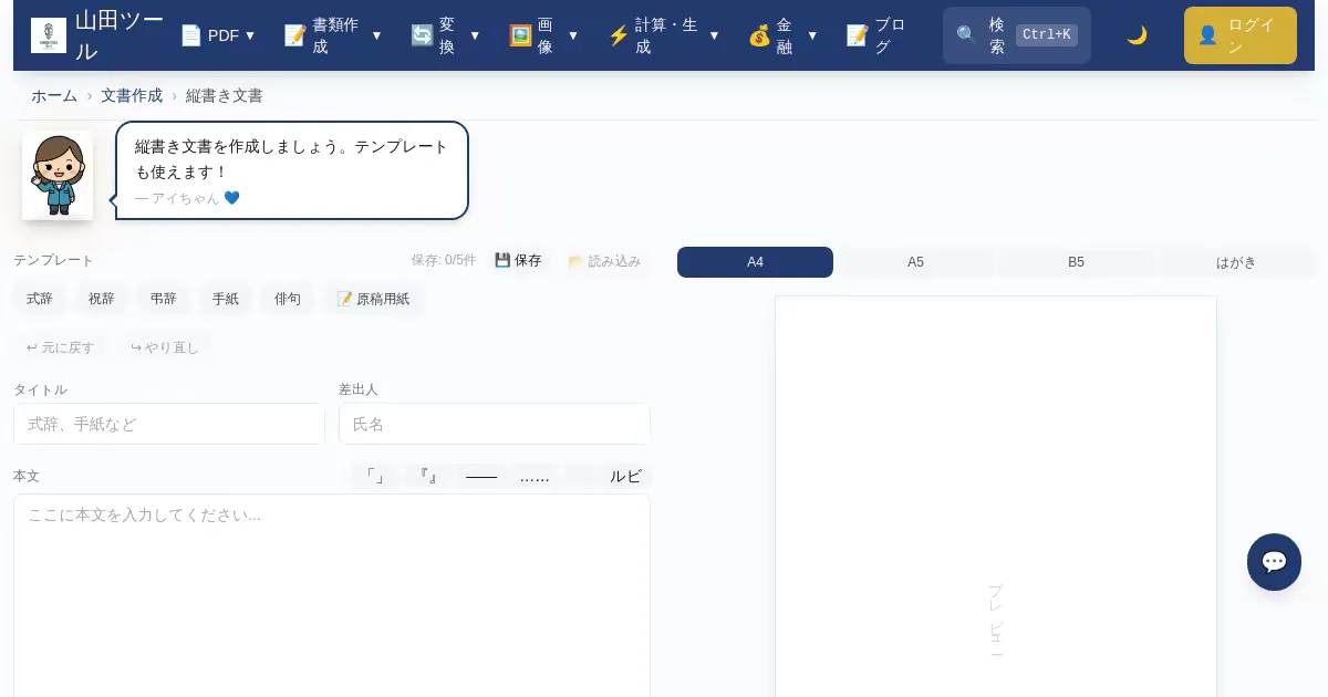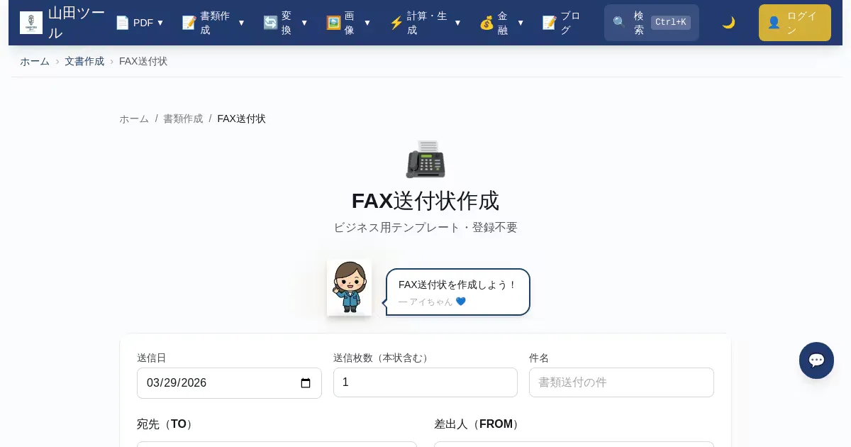 FAX送信時の送付状を無料で作成。宛先、送信者、枚数、メッセージを入力するだけで完成します。登録不要でブラウザ上で完結し、60分で自動削除。