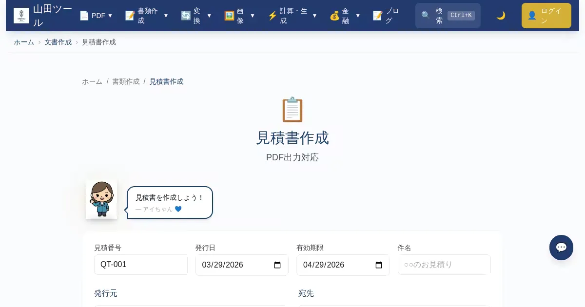 見積書を無料で作成。消費税の自動計算(10%・8%軽減税率対応)、PDF出力対応、会社ロゴのアップロードに対応。登録不要でブラウザ上で完結。