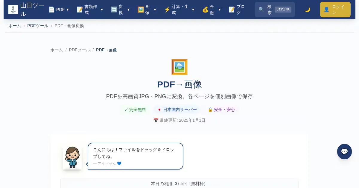 PDFをJPGやPNG画像に変換。プレゼン資料への挿入、SNSでの共有、サムネイル作成に便利。複数ページ対応で各ページを個別の画像ファイルとして出力。解像度指定も可能。