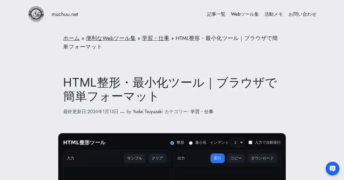 HTMLを整形(フォーマット)または最小化(ミニファイ)できるブラウザ完結ツール。インデント幅の調整、コメント削除オプション、ダウンロード機能に対応。