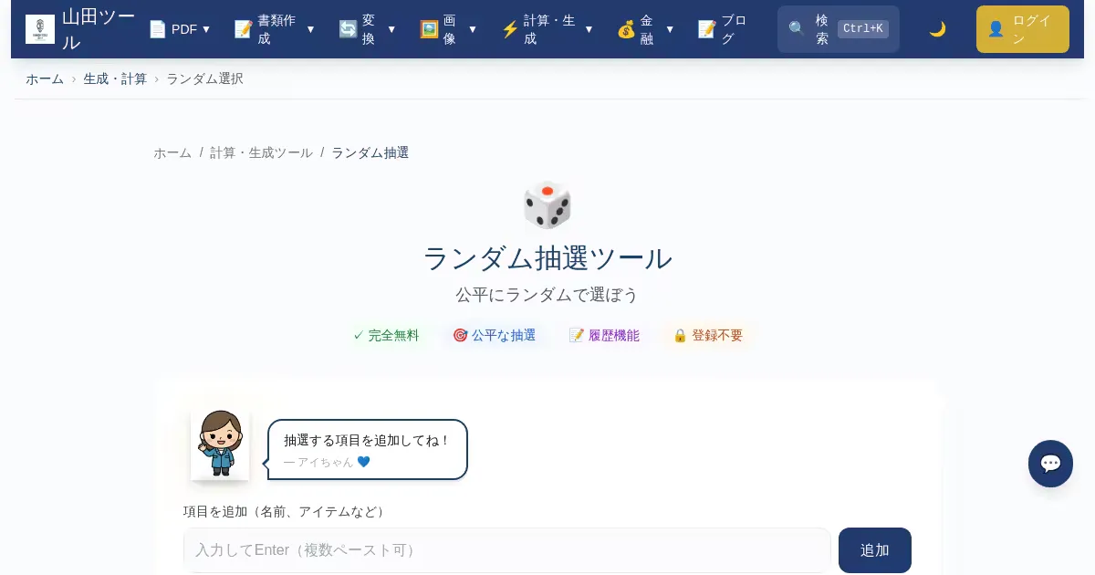 名前や数字をランダムに抽選。忘年会の幹事決め・プレゼント交換・チーム分け・順番決めなど複数用途に対応。暗号論的乱数生成を採用し、公平な抽選が可能。
