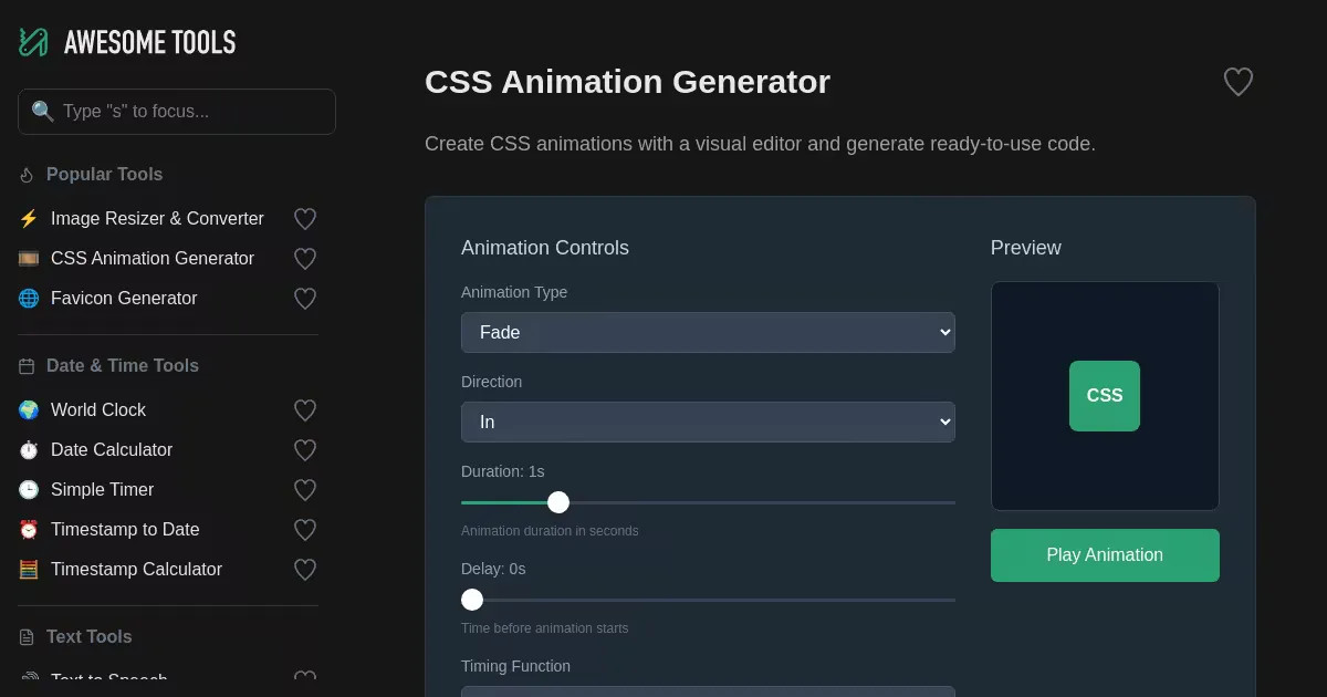コーディング不要でCSSアニメーションを作成できるビジュアルエディタ。キーフレームやアニメーションの種類、持続時間、タイミング関数などを設定してCSSコードを生成できる。