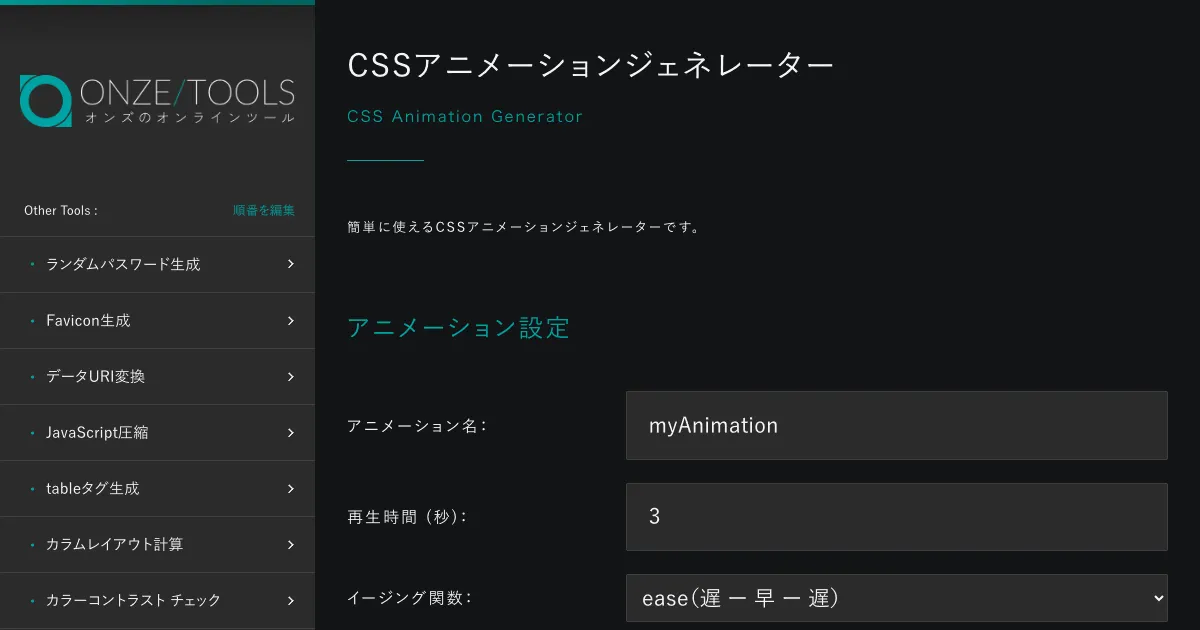 簡単に使えるCSSアニメーションジェネレーター。アニメーション名・再生時間・イージング・遅延・繰り返し・キーフレームなどを設定してCSSアニメーションコードを生成できる。