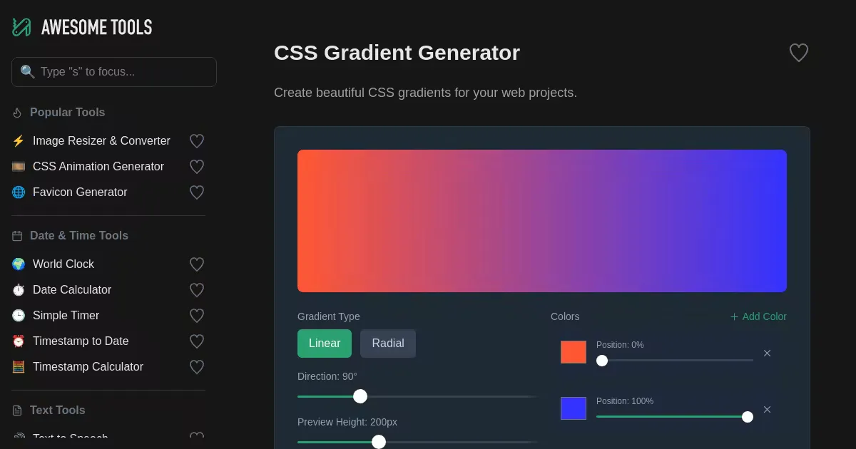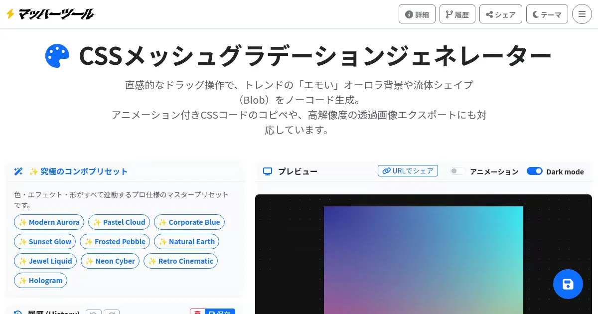 インタラクティブなコントローラーで美しいCSSグラデーションを作成できるツール。色・方向・カラーストップをカスタマイズし、すぐに使えるCSSコードを生成。25種類以上のプリセットも搭載。