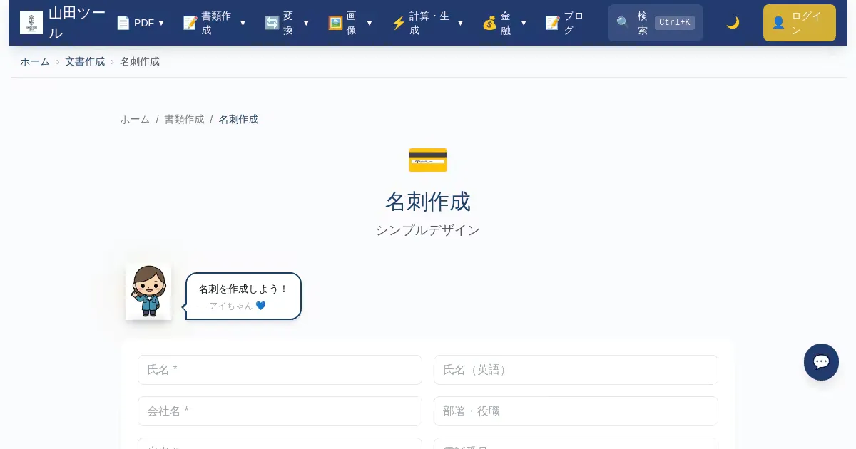 シンプルで美しい名刺を無料作成。会社名、名前、連絡先を入力するだけ。QRコード付きの名刺も作れます。印刷用PDF出力対応。登録不要でブラウザ上で完結。