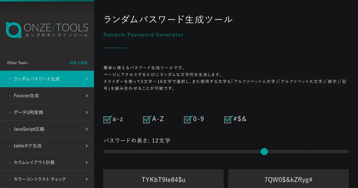 簡単に使えるパスワード生成ツール。文字数(4〜16文字)や使用する文字種(英大文字・英小文字・数字・記号)を組み合わせてランダムなパスワードを生成できる。