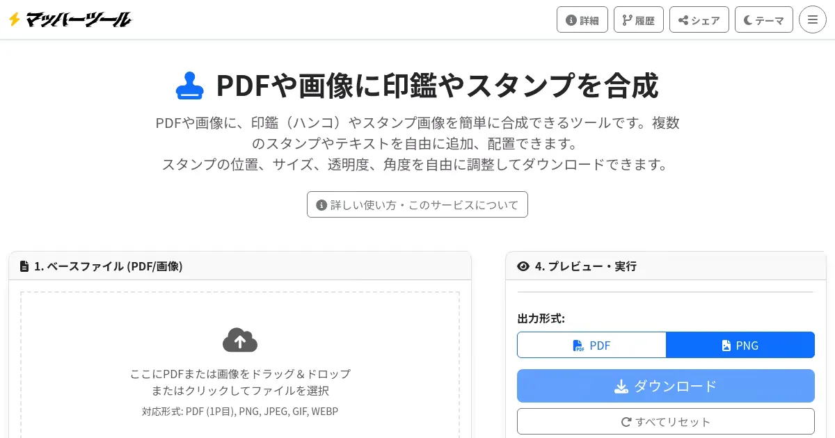 PDFや画像ファイルに印鑑・スタンプ画像を合成できるツール。位置・サイズ・透明度・回転を調整でき、複数スタンプや文字の重ね合わせにも対応。PDF・PNG形式で出力可能。登録不要・完全無料。